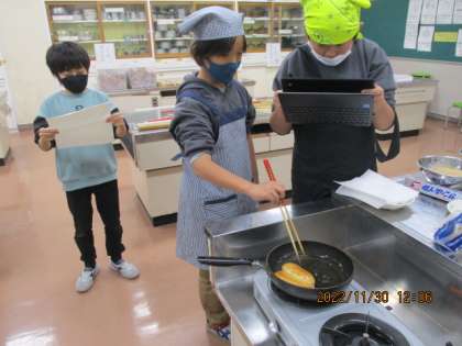 5年生の総合の学習で、昔の給食について調べているグループの子供たちが、いよいよ昔つくられていたという揚げパンを実際につくってみることにしました。事前に調べた作り方を参考に、協力してパンを揚げたり砂糖味ときなこ味の2種類を味付けしたりしました。