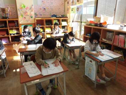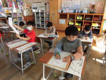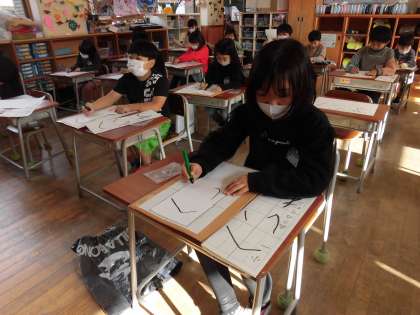 1年生にとって、初めての書き初め練習が始まりました。今年の言葉は「へいわ」です。子どもたちは、初めての硬筆墨に苦闘しながらも、丁寧に書き進めることができました。
