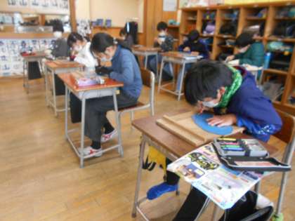 昨年度学習した、「前へ彫る」「板を動かす」といった基本的なことも子供たちは覚えていました。