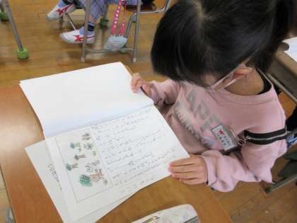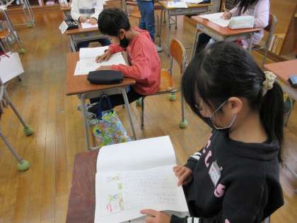 国語科の学習では、お話の作者になり、自分で物語を作りました。子供たちの想像力は、とても豊かです。今日は互いのお話を読み、感想を書きました。