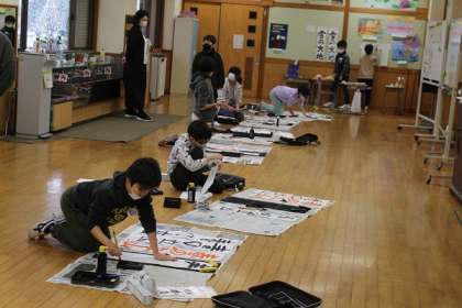 すみれ・ひまわり級は、1〜6年生が集まってワークスペースで書き初め大会を行いました。3〜6年生は毛筆。みんな真剣に一筆一筆を運ぶ様子から、冬休みの練習の成果を発揮しようという意気込みが感じられました。