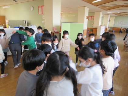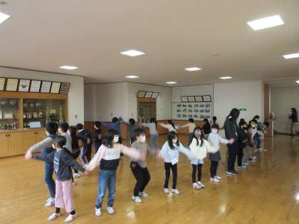 音楽科の学習では、「ずいずいずっころばし」や「なべなべそこぬけ」をして楽しみました。2人で始めた「なべなべそこぬけ」でしたが、自然とその輪がどんどん大きくなり、ついには29人全員でやってみることになりました。みんなの笑顔がたくさんあふれる素敵な時間になりました。