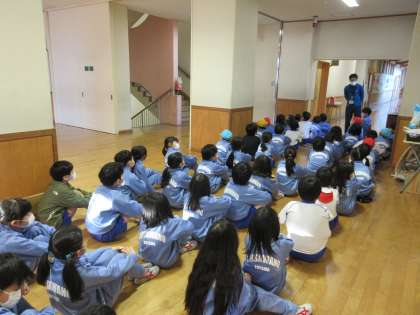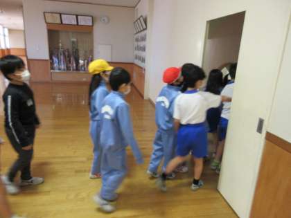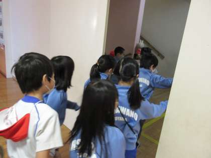 今回の避難訓練では、防火シャッターや防火扉の位置や役割について学びました。その後、実際に、防火扉から安全に避難する訓練を行いました。もしもの時に少しでも落ち着いて行動できるよう、訓練から真剣に取り組む子供たちです。