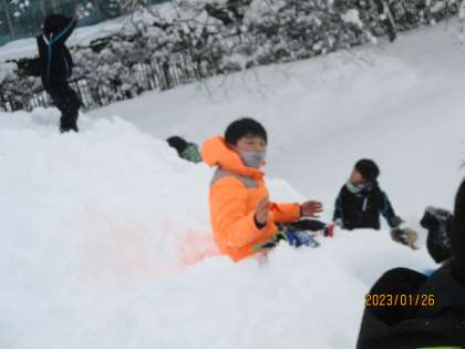 ソリやスコップといった道具がなくても子供たちは力を合わせ、雪あそびを楽しんでいました。
