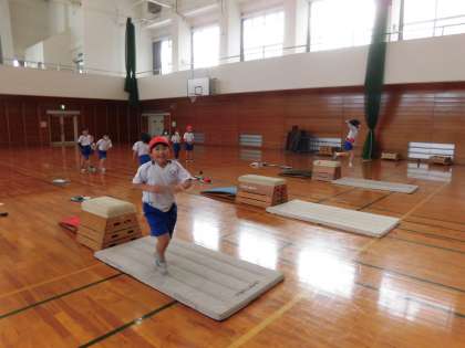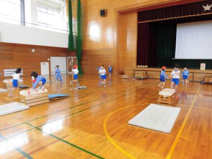 1年生の体育の学習では、跳び箱遊びに取り組んでいます。跳び箱に乗ってジャンプする踏み越し跳びや、跳び箱の横を側転のように飛び越える横跳び等に挑戦しました。