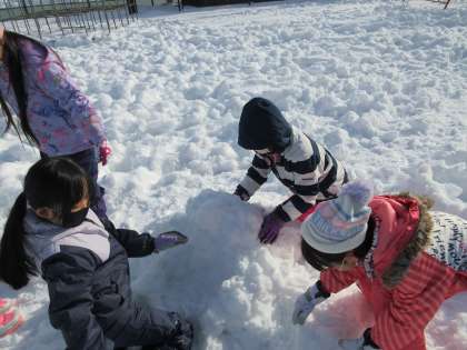雪の上で寝そべったり、雪山を作ったりと友達と仲よく過ごしていました。