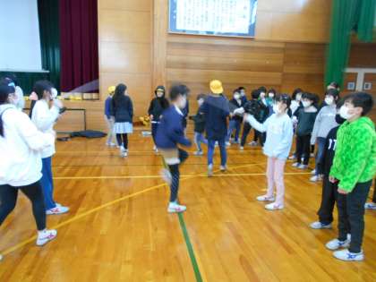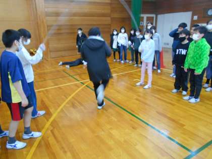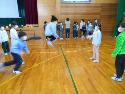 学年全体で「大縄跳び」をしました。学年全体が一つになって、みんなで跳んでいました。