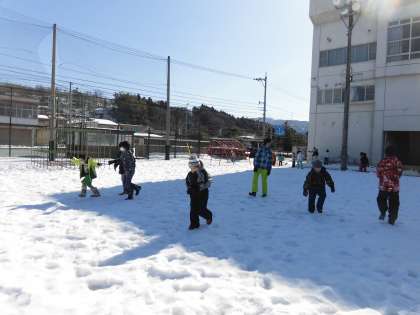 今日は、すっきりとした快晴の中、6年生と一緒に雪遊びを楽しみました。長縄跳びでお世話になっているグループのお兄さん、お姉さんと一緒に、嬉しそうに雪合戦をしたり、雪だるまを作ったりする1年生でした。