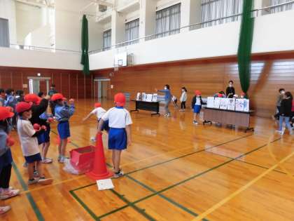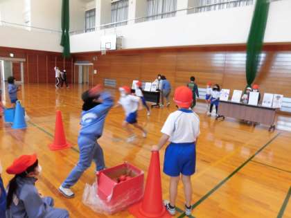 今日は、保健委員会が開いたウイルスたおそう集会に参加しました。邪悪な顔をしたウイルスが描いてあるボードに向かってボールを投げつけ、ウイルスを退治します。