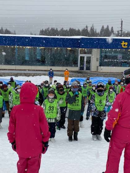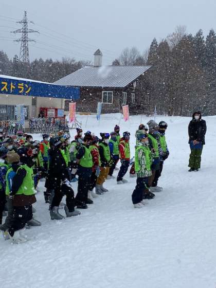 2月10日(金)6年生 スキー教室 その2 公開日 2023/02/10 更新日 2023/02/10 6年生 らいちょうバレースキー場に到着し、開講式を行いました。 スキー場は、雪が降っています。 これからインストラクターの指導の下、スキー教室が始まります。