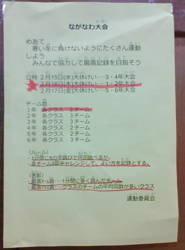 子どもきしゃ★2月15日(水)1年生 ながなわ大かい がんばるぞ! 公開日 2023/02/15 更新日 2023/02/15 子供記者のページ ながなわ大かいのおしらせです。 れんしゅうのしゃしんはありません。 れんしゅうしていると しゃしんがとれないからです。 ※大会は来週に延期になりました。