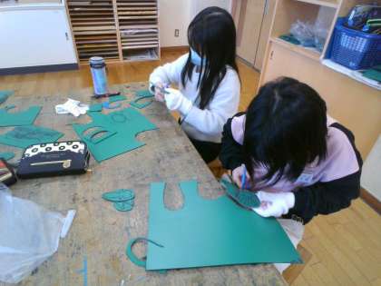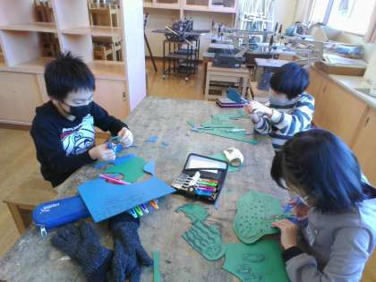 版もだいたい彫り終わり、もうすぐ印刷です。今日は彫ったものをスタンプできるように、一生懸命ハサミで切りました。スタンプした作品がどんなものになるか、とても楽しみです。