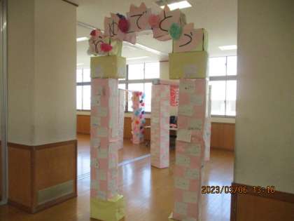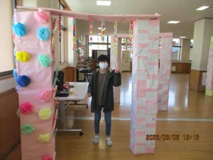 掲示プロジェクトの6年生フロアの飾り付けが、終わりました。みんなからのメッセージが飾られた、手紙トンネルが完成です!早速、6年生さんが通ってくれていました。