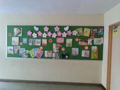 としょしつの前にあるいろいろな本です。おりがみの作り方があります。みなさんは、としょしつにいっていますか。