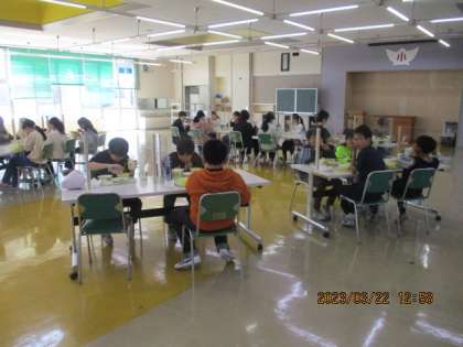 会食の日は、全部で3日間を予定しています。全クラスは入れないので、各クラス数名ずつ、一クラス分の人数がサルビアルームで会食しました。総合的な学習の時間で、会食について調べていた子供たち、来年度の会食の実現に向けて新しい挑戦の始まりです。