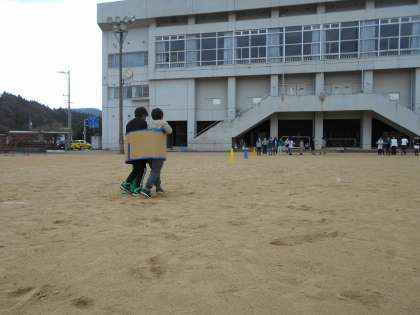 写真はデカパン競争をしているところです。デカパンは段ボールで代用しています。
