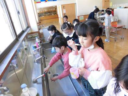 給食後は、歯磨きタイムです。1本1本丁寧に歯を磨いている素敵な子どもたちの姿が見られました。保護者の皆様には、歯ブラシ・コップ・巾着を用意していただき、ありがとうございました。