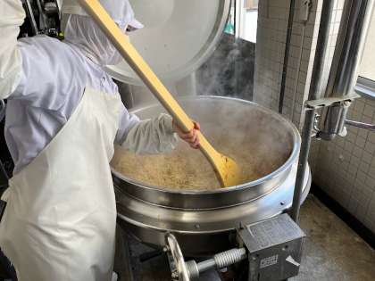 大きな釜で作りますが、混ぜるのが重くて力仕事です。