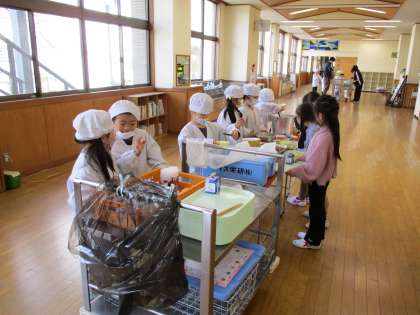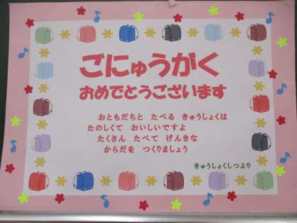 初めての給食に、1年生はわくわくしていました。3時間目の途中から「お腹が空いたなあ」と言っていました。給食室から1年生へのメッセージをもらって、特別な給食の時間になりました。