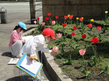 花壇やグラウンドには、寒い冬を乗り越えきれいな花をたくさん咲かせています。気に入った花を見付けて、上から見たり、下から見たりしながら思い思いにスケッチを楽しみました。
