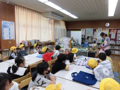 今日は、2年生になって初めての図書室利用の日です。最初に、司書の先生から自己紹介があり、図書室の利用の仕方についてお話を聞きました。