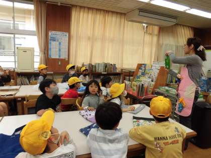 その後、1年生で学習した「大きなかぶ」のエプロンシアターを見せていただきました。子どもたちは、先生と一緒に「うんとこしょ、どっこいしょ」と、かぶを引っ張るセリフを声に出して楽しんでいました。