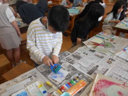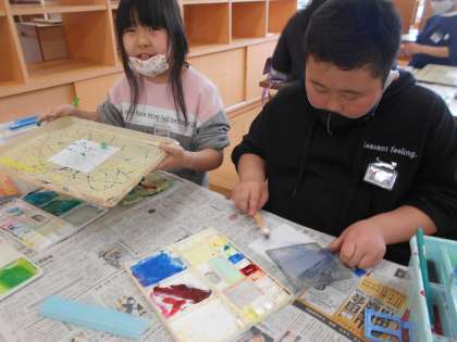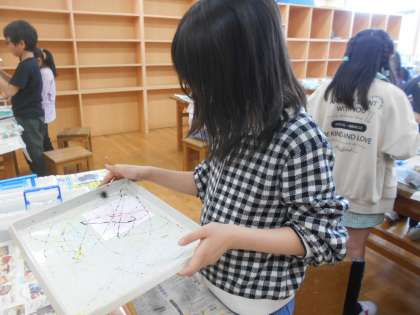 いろいろな材料を使ってできるもようは面白いですね。金網を歯ブラシでこすると、しぶきがきれいに散ってきれいです。ビー玉に絵の具を付けて転がすと跡が付いて躍動感が出ます。他にも様々。今日は、いろんなもようを付けることを楽しみました。
