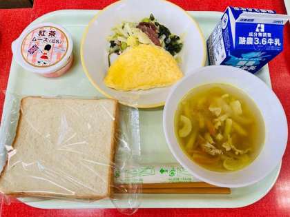 本日の献立は、食パン、オムレツ、海藻サラダ、マルガトーニ(英国風カレースープ)、紅茶のムース、牛乳 です。