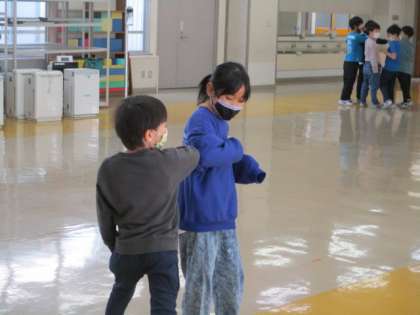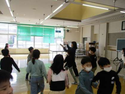 ランチルームでいろいろなリズム遊びを行いました。音をよく聞くことを大切にした遊びでした。