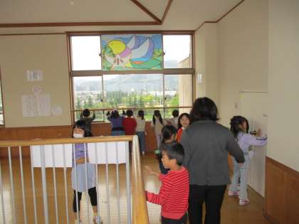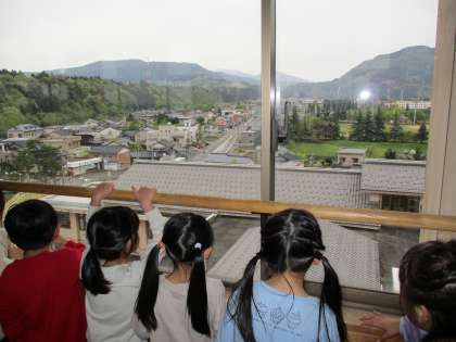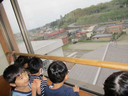 4月19日(水)1年生 学校探険 その2 公開日 2023/04/21 更新日 2023/04/21 1年生 さて、秘密の部屋は?と行き着いた場所は、学校の4階のさらに上。階段の先には、展望室がありました。「私のお家が見える」「あの建物の横が僕の家だよ」と、展望室から見える景色に、みんなわくわくしていました。