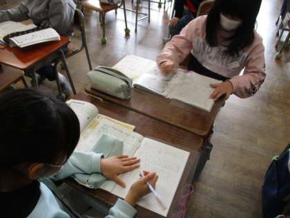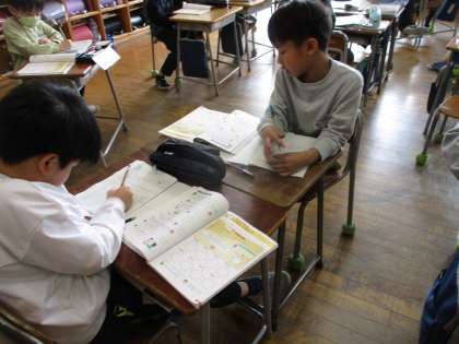 算数の時間の様子です。ペアになり、問題を出し合っています。お互いに学び合うのはいいですね。