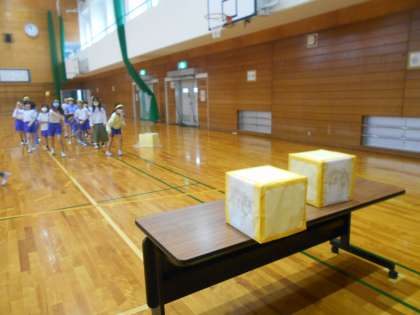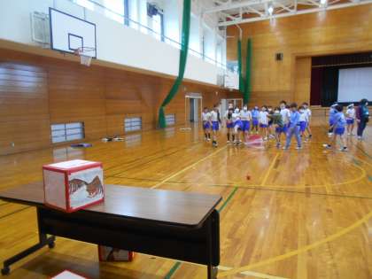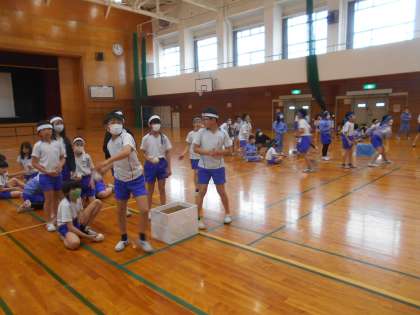 大玉転がしの後は、ねらいうちの練習です。的に向かって大きく振りかぶって投げるようにこれからも練習していきます。