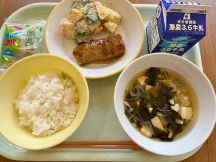 ごはん、鯉のぼりハンバーグ、ごまポテトサラダ、若竹汁、かしわもち、かしわもち、牛乳 です。