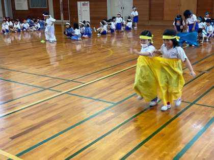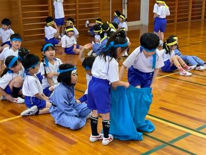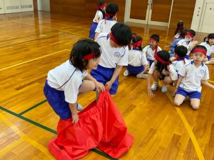 2人で協力して、デカパンをはいたり動いたりする練習をしました。