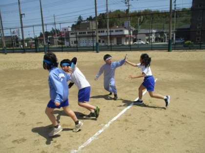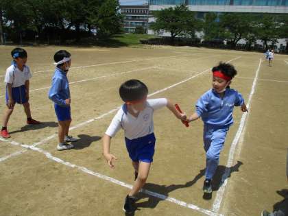 今日は学年でリレーを行いました。クラスごとに、各団で競い合いました。