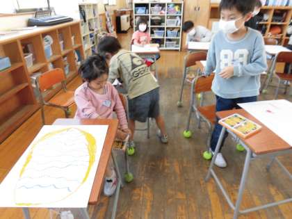 その後、実際に割れる前の「ふしぎなたまご」を画用紙いっぱいに描きました。完成が楽しみです。