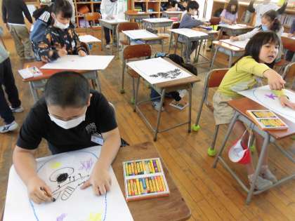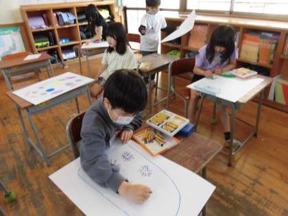 図画工作科の新しい学習の名前は、「ふしぎなたまご」です。何が飛び出すか分からない「ふしぎなたまご」…。子どもたちは、「虹が出てくるよ」「恐竜も!」「地球が出てくる」「たまごの中からたまごが出てくるよ」と、想像力豊かに自分のイメージした「ふしぎなたまご」について語りました。