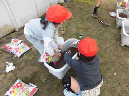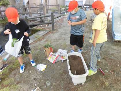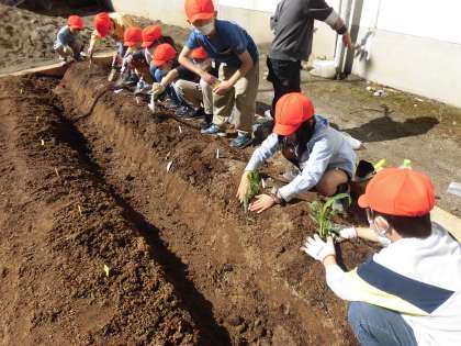 今日の「やさいばたけ」の学習では、ついに野菜の苗(種)を植えました。各家庭で用意していただいた苗(種)を、子どもたちは嬉しそうな表情で畑やプランターに植えていました。