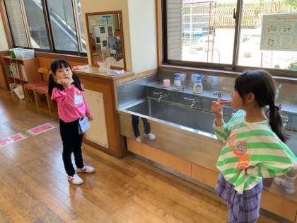 給食を食べ終えた子供たちの様子です。「もうすぐ歯が抜けそう」「グラグラしてきた」などと、自分の歯に関心をもち、丁寧に磨いていました。
