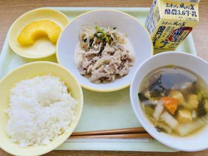 本日の献立は、ごはん、豚肉の生姜焼き、ナムル、中華スープ、パインアップル、牛乳 です。