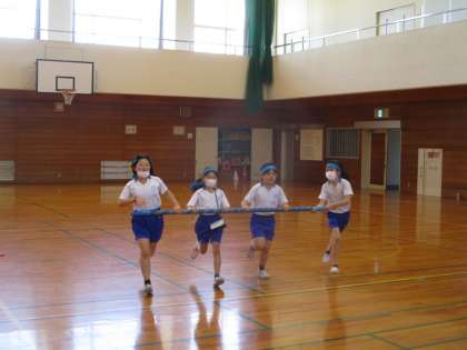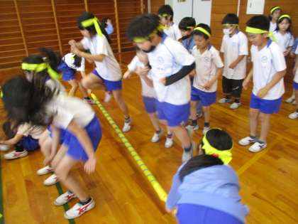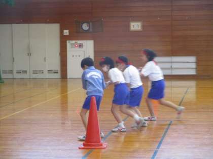今日も3、4年生合同で台風の目を行いました。台風の目は3、4年生二人ずつの4人1組で行います。どのようにしたら速くできるか、4年生と一緒に考えていました。
