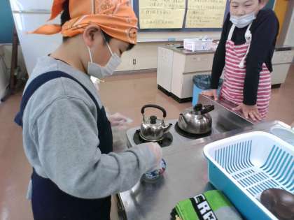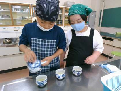 家庭科の学習で、ガスコンロを使ってお茶をいれてみました。