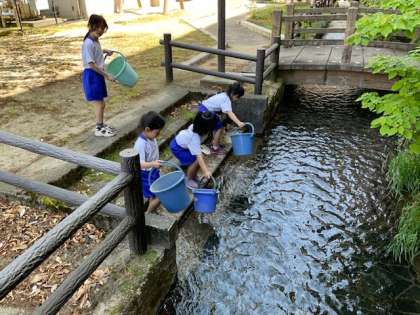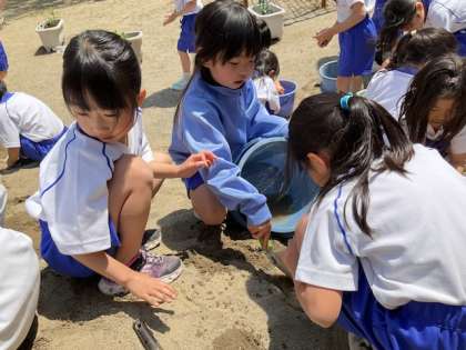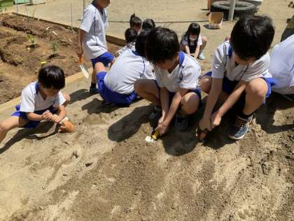 今日の図工は、砂場で触ったり掘ったり作ったり水を流したりするなど、子供たちは思い思いの活動をしました。