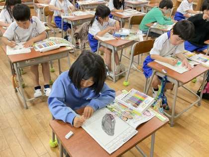 生活科では、アサガオのたねの観察をしました。「色は茶色、黒っぽいな」「石みたいにかたいよ」などと、よく見て記録していました。