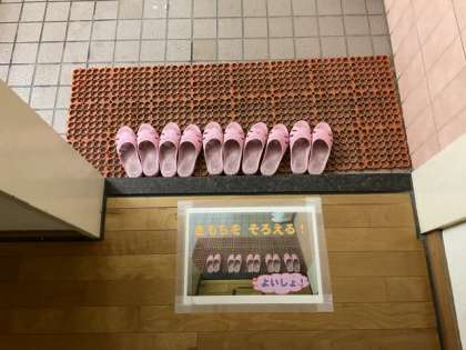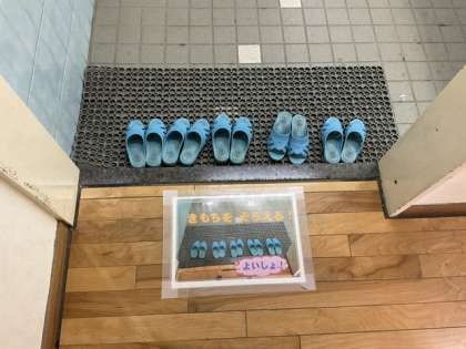 子供たちが下校した後のトイレ。今日は、向きがそろっていないスリッパが1組ありました。こんなところからも、1年生の子供たちの成長を感じます。