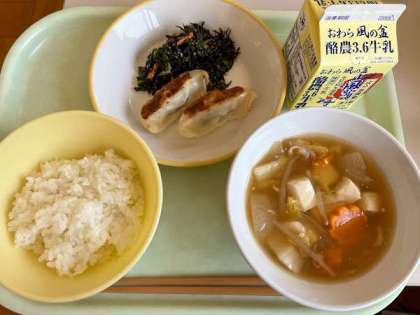 本日の献立は、ごはん、焼き餃子、ひじきのごま和え、豆腐の野菜あんかけ、牛乳 です。