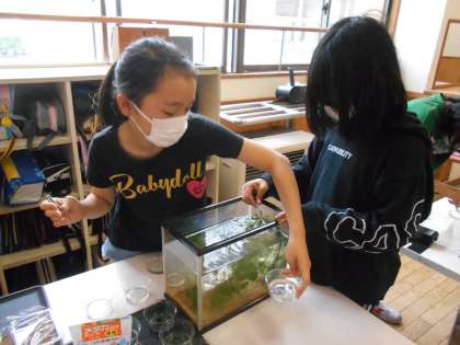 インゲン豆の世話をしたり、休みの日で産み付けられたメダカの卵を採取したり