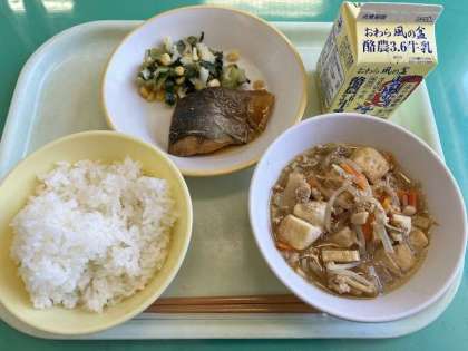 本日の献立はごはん、あじのみりん焼き、チンゲンサイソテー、厚揚げの中華煮込み、牛乳 です。