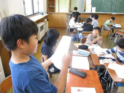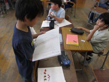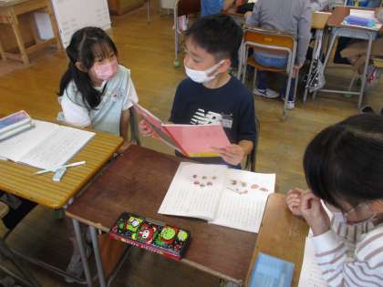 国語の「こまを楽しむ」の一場面です。文章に出てくる6つのこまの中から、自分の好きなこまを一つ選び、文章にしました。それをグループ内で発表しました。何のこまがお気に入りだったのか、お子さんに聞いてみてください。