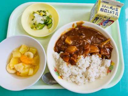 本日の献立は、麦ごはん、食べキリンハヤシ、白菜サラダ、フルーツミックス、牛乳 です。